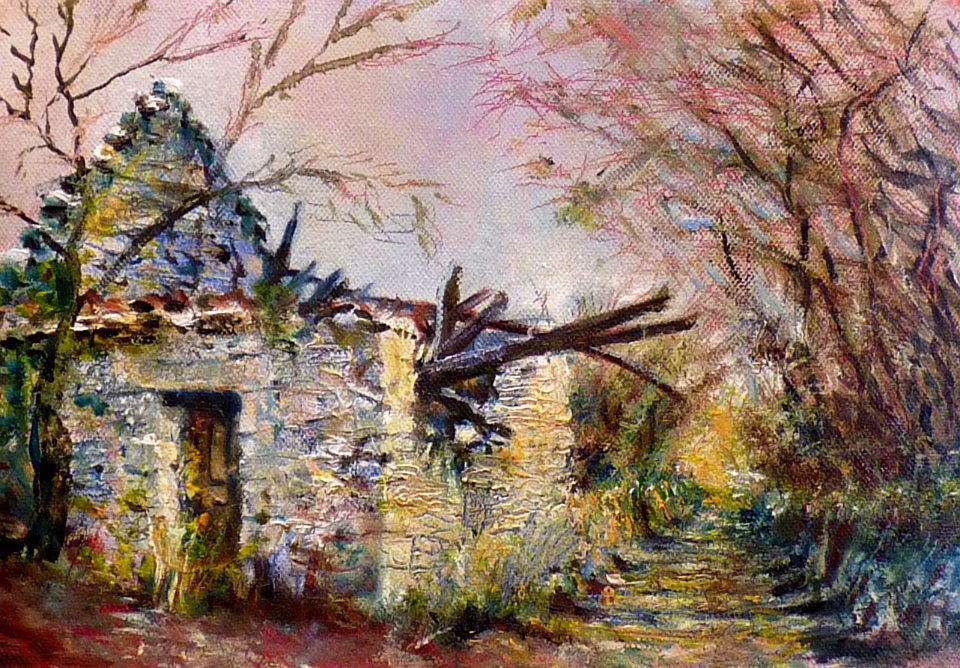Cabane en ruine au bord d'un chemin du causse de Rignac Huile sur toile marouflée sur panneau, 20x27cm