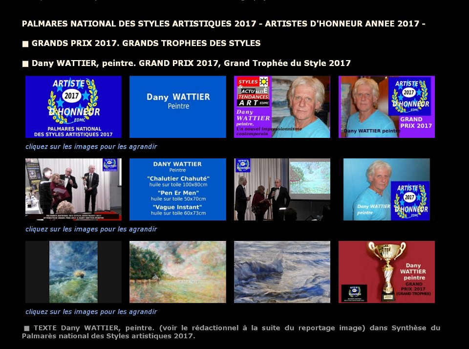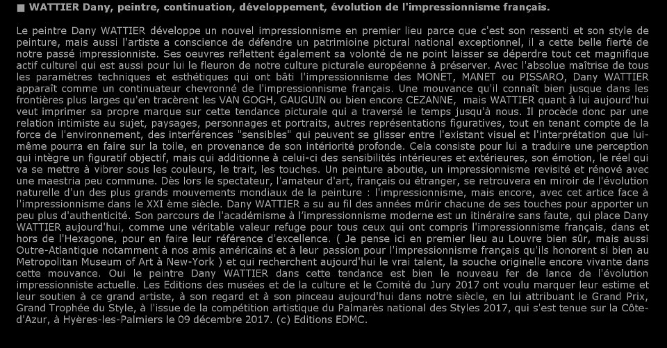 PALMARES NATIONAL DES STYLES ARTISTIQUES 2017 - ARTISTES D'HONNEUR ANNEE 2017 ■ GRANDS PRIX 2017. GRANDS TROPHEES DES STYLES■ Dany WATTIER, peintre. GRAND PRIX 2017, Grand Trophée du Style 2017WATTIER Dany, peintre, continuation, développement, évolution de l'impressionnisme français.