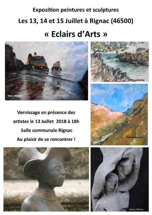 Exposition Eclair d'Art. Des artistes locaux exposent pendant la fête du village. 3 peintres: Catherine Stock, Sophie Raynaud, Dany Wattier 2 sculpteurs: Tina Serre, Thierry Girou Salle communale de Rignac à coté du "Petit Rignac"