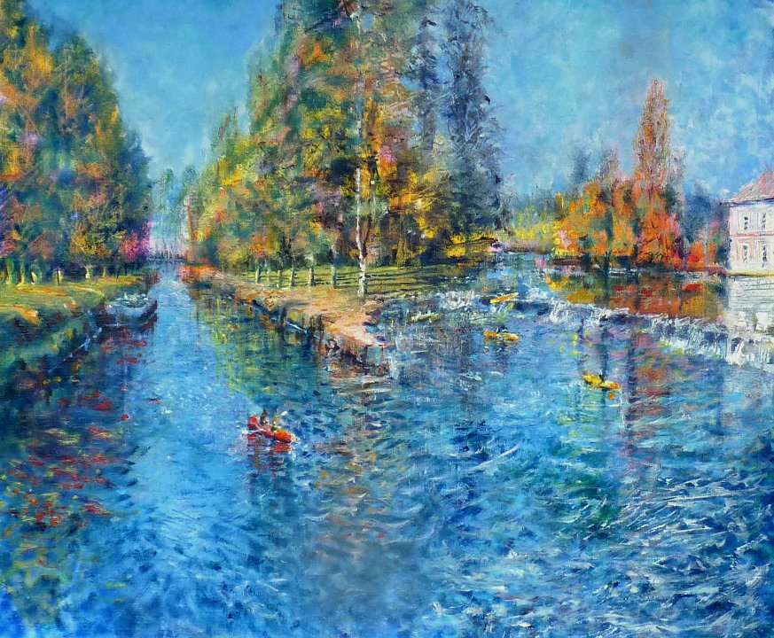 Un dimanche a maléstroit La présentation se poursuivit avec "Dimanche à Malestroit", peinture, huile sur toile 50x70cm. Un tableau de paysage fluvial, traduisant cette atmosphère très particulière de l’eau dans les terres. Dans cette œuvre , Dany Wattier nous montre un talent impressionniste. On y retrouve comme un prolongement de ses sentiments intérieurs au bout du pinceau. La lumière en miroitement sur l'eau, les arbres, le ciel, tout vibre de délicatesse et de vie tranquille. Pour Dany Wattier ..."C’est dimanche : le temps est comme ralenti. L’automne étire les ombres sur le sol et exacerbe les couleurs en parfaite harmonie avec la douceur de l’air". Il précise ..."En peignant "Un dimanche à Malestroit", j'ai tenté de retranscrire, sur la toile, l'ambiance et mon ressenti de ce dimanche après-midi d'automne à Malestroit. Le tableau se situe au confluent du canal de Nantes à Brest et de l’Oust; Péniche à l’arrêt, canoës qui glissent lentement, tout participait à la langoureuse quiétude de ce Dimanche à Malestroit"... On comprend toute la part de sentiments profonds qui habitent cet artiste face au paysage. On reconnait là un trait sensible du talent des grands impressionnistes, lorsqu'ils entraient ainsi en communion avec le paysage, afin d'en saisir, d'en peindre l'âme. De Pissaro à Monet, l'enjeu est toujours le même aujourd'hui, comme chez Wattier, il faut absoluement capturer l'essence du paysage, surtout en y ajoutant de la vie, par la lumière. Peindre la lumière... C'est à force de pratique, par son experience, ses recherches au fil de ses nombreux tableaux, que Dany Wattier a pu, enfin, y parvenir. Il fait partie des rares artistes qui savent éclairer le paysage, illuminer la Nature dans sa vérité, maitriser et traduire dans l'oeuvre d'art, la fugacité et la subtilité de la lumière du jour, celle là même qui enveloppe le paysage en différentes saisons