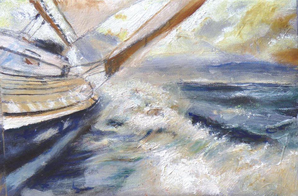 Oeuvres sélectionnées : En regate Ensuite l’oeuvre "Régate", était présentée, une peinture à l’huile sur toile 30X20cm, qui exprime la passion de l'artiste pour la mer et les bateaux. Il est apparu dans ce tableau une construction esthétique particulièrement intéressante, techniquement très réussie. En effet avec ce voilier fortement penché, le sillage et les vagues, avec la position inclinée de la voile avant, le peintre à su structurer l'oeuvre, afin que tout participe à créer un mouvement dans un axe central autour de lignes de fuites. Celles-ci convergent vers l'horizon, en donnant au spectateur une sensation de vitesse et d'équilibre, dans l'immensité de la mer.