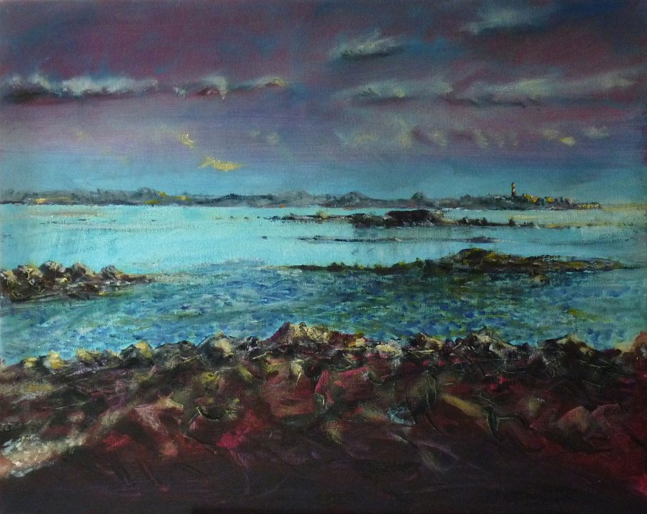 Sur les rochers de Cromenach Enfin , en clôture des présentations des oeuvres et du style de Dany Wattier ce fut le tableau "Sur les Rochers de Cromenach", peinture, huile sur toile 38x46cm . Le titre est significatif comme le souligne l'artiste à propos de cette oeuvre : "Le tableau est peint sur le motif, le chevalet calé sur des rochers éloignés de la côte. L’endroit est accidenté et inconfortable et n’est accessible qu’à marée basse, néanmoins le point de vue vaut l’effort.C’est donc en sympathie avec les éléments naturels que j’ai réalisé ce tableau, tenant compte de la marée, mais aussi du ciel; en effet, la lumière est particulièrement changeante sur cette côte sud de la Bretagne, une luminosité aussi fugace qu’exceptionnelle (on dit qu’il fait beau cinq fois par jour). Il s’agissait juste de figer rapidement l’instant sur la toile. Cromenach se situe près de Muzillac, à l'extrémité de la plage de Bétahon. Sur le tableau, on distingue, dans le lointain, la pointe de Pen Lan, avec son caractéristique phare carré blanc et rouge"... (Dany Wattier). L'artiste apporte ici des précisions sur la manière dont a été réalisée cette oeuvre, mais aussi, sur des détails topographiques, qui permettent de bien situer le point de vue sur le littoral. Une oeuvre de grand talent, qui a su saisir l'âme d'un spectacle exceptionnel que la Nature nous offre à Cromenach. Il émane de cette peinture une vérité émouvante, dans laquelle se confondent tout à la fois, spiritualité, romantisme et mélancolie. Dany Wattier nous restitue ici tout l'impact de la magie du lieu.