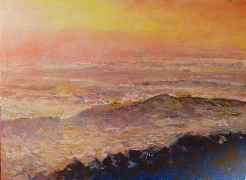 Vagues du soir a Betahon. La présentation de "Vagues du Soir a Bétahon" peinture, huile sur toile 73x60cm. eu lieu devant le Comité du Jury à Monte-Carlo, montrant une sensibilité ultime dans le ressenti et l'expression des couleurs, de la lumière, traitée dans une infinité de nuances et de tonalités orangées. Cette marine apparaissant comme un modèle de beauté poétique. Dany Wattier, peintre figuratif, de tendance impressionniste, aime à peindre sur le motif, au plus près de la Nature. La plage de Bétahon, s’étend de Pen Lan à Cromenach, près de Muzillac dans la Morbihan. Le peintre dans ce tableau a su se positionner afin d'avoir le point de vue idéal, du moins celui qui va correspondre le mieux à ses intentions, à ce qu'il a pu déja voir et qu'il voudra traduire picturalement. Il a choisi cette plage de Bétahon car selon l'artiste du fait de son orientation, elle est un lieu privilégié pour admirer de magnifiques couchers de soleil. Dany Watt par sa peinture immortalise sur sa toile ce coucher de soleil dans une expression sublime et grandiose.