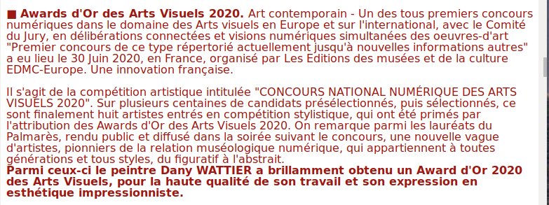 Dans le cadre du Concours numérique national des Arts Visuels, 2020, organisé par les Editions des musées et de la culture EDMC-Europe, le Comité du Jury a attribué à Dany Wattier, un AWARD D'OR, au titre de votre expression picturale impressionniste.